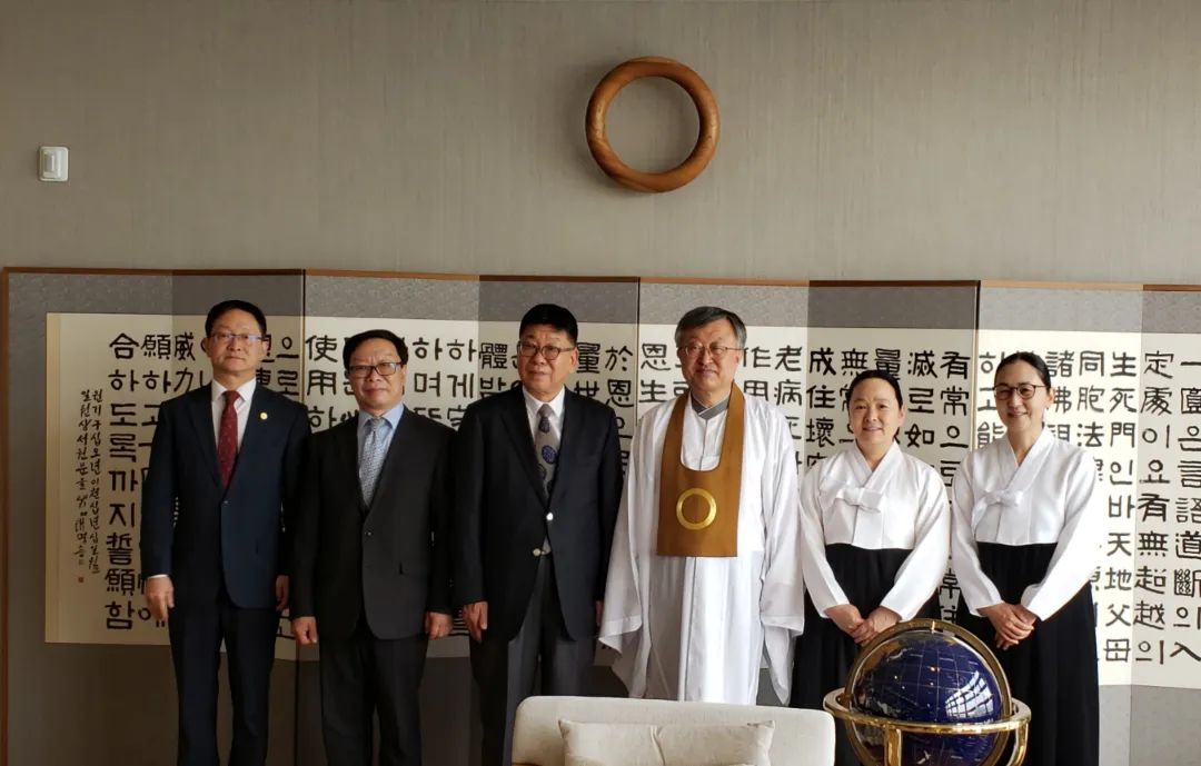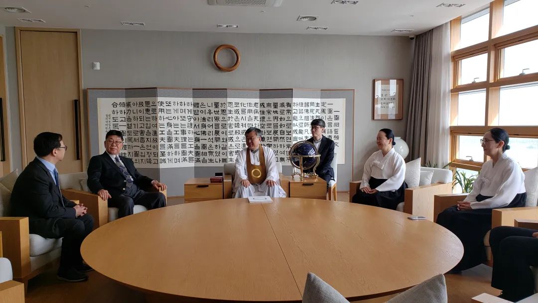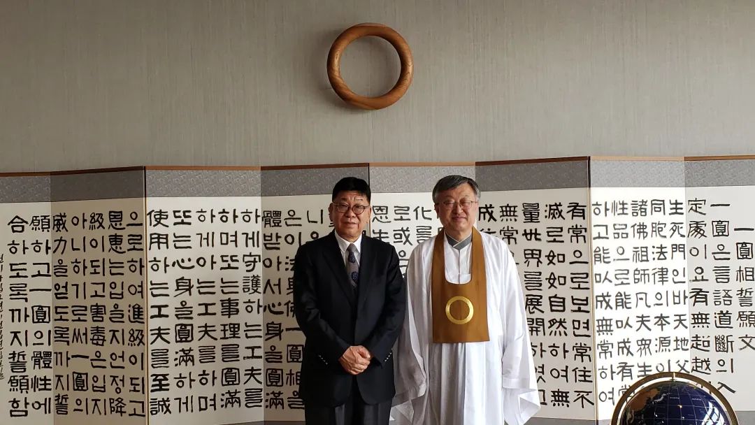 4月13日上午,察哈尔学会会长韩方明拜访了在首尔的韩国圆佛教教政院,会见了教政院长报山法师。