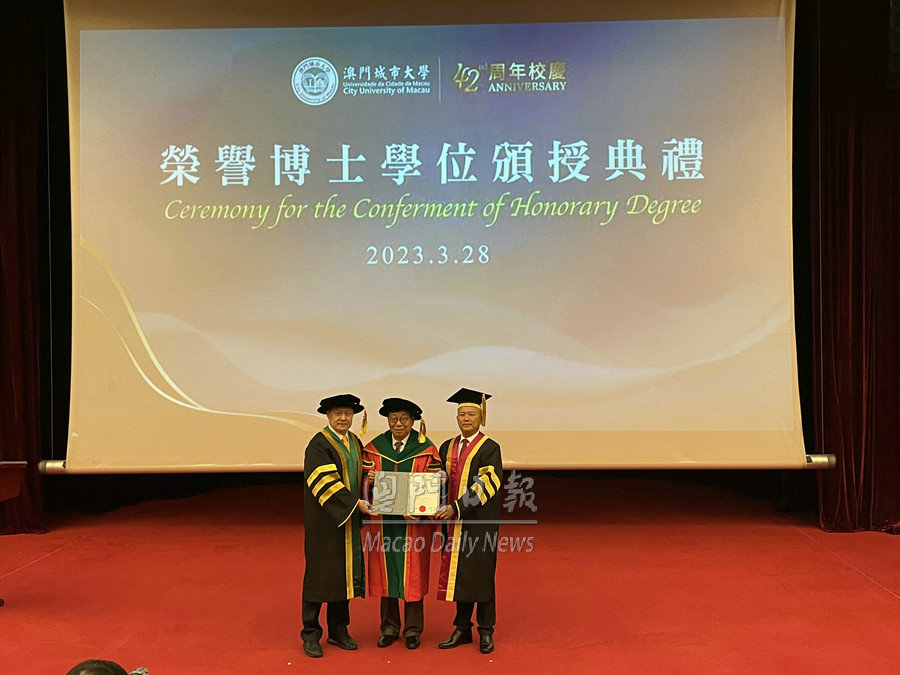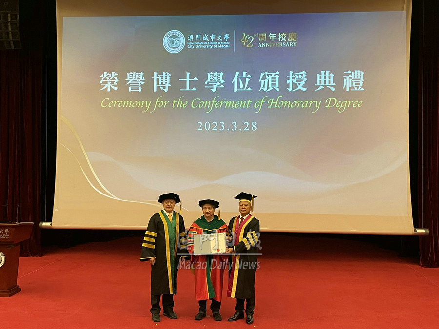 【澳門日報消息】澳門城市大學舉行榮譽博士頒授典禮,向余華教授、韓方明博士頒授榮譽博士學位,表彰他們在各自領域的卓越成就,和為社會和高等教育發展作出的重大貢獻。 頒授典禮今日上午十時半在該校氹仔校區文化中心舉行,本澳政府部門官員、社會人士,以及本澳兄弟院校、各中學的領導和代表,蘇州大學、中南財經政法大學等內地友校出席見證。
